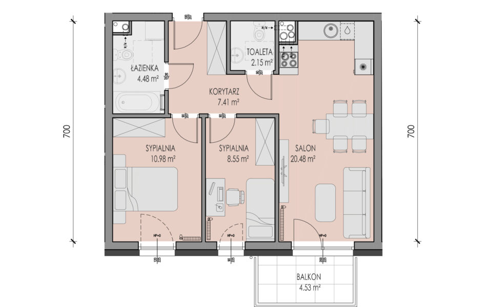 Prezentowane mieszkanie znajduje się na pierwszym piętrze budynku przy ulicy Legionów 25A, z oknami wychodzącymi na zachód oraz balkonem o powierzchni 4,53 m2. Składa się z salonu z aneksem kuchennym, dwóch sypialni, łazienki, toalety oraz przedpokoju. Jest wykończone w standardzie deweloperskim: