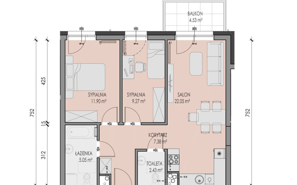Prezentowane mieszkanie znajduje się na trzecim piętrze budynku przy ulicy Legionów 25A, z oknami wychodzącymi na wschód oraz balkonem o powierzchni 4,53 m2. Składa się z salonu z aneksem kuchennym, dwóch sypialni, łazienki, toalety oraz przedpokoju. Jest wykończone w standardzie deweloperskim:
