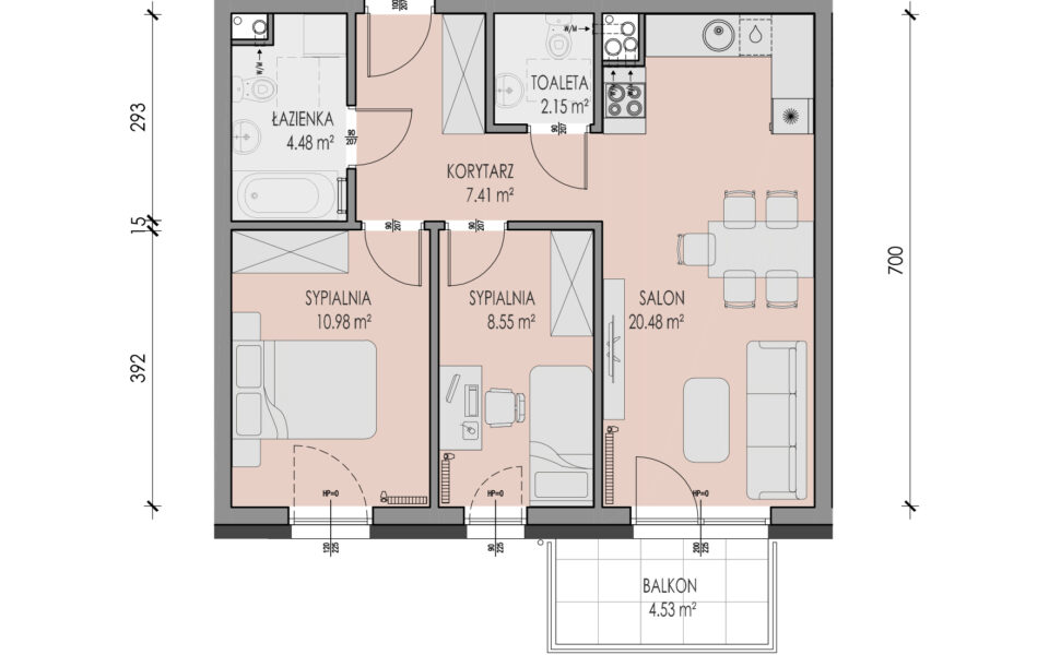 Prezentowane mieszkanie znajduje się na trzecim piętrze budynku przy ulicy Legionów 25A, z oknami wychodzącymi na zachód oraz balkonem o powierzchni 4,53 m2. Składa się z salonu z aneksem kuchennym, dwóch sypialni, łazienki, toalety oraz przedpokoju. Jest wykończone w standardzie deweloperskim: