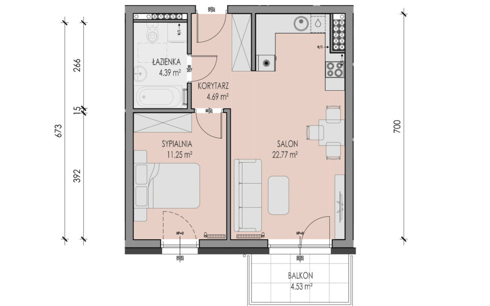 Prezentowane mieszkanie znajduje się na czwartym piętrze budynku przy ulicy Legionów 25A, z oknami wychodzącymi na zachód oraz balkonem o powierzchni 4,53 m2. Składa się z salonu z aneksem kuchennym, sypialni, toalety oraz przedpokoju. Jest wykończone w standardzie deweloperskim: