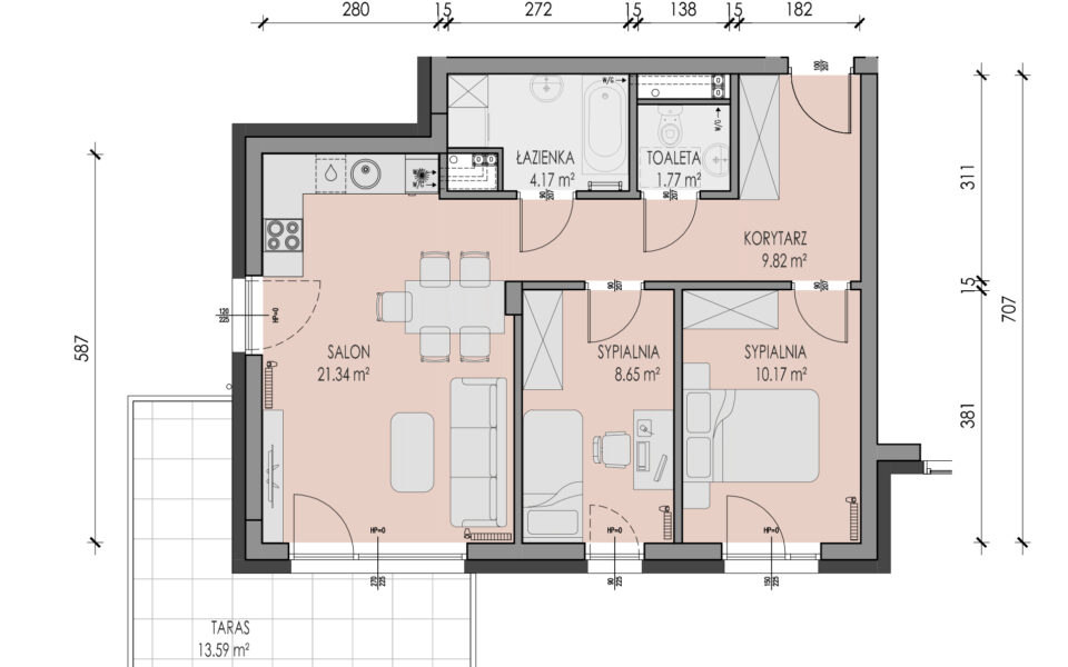 Prezentowane mieszkanie znajduje się na parterze budynku przy ulicy Legionów 25B, z oknami wychodzącymi na północ i zachód oraz dużym tarasem o powierzchni 13,59 m2. Składa się z salonu z aneksem kuchennym, dwóch sypialni, łazienki, toalety oraz przedpokoju. Jest wykończone w standardzie deweloperskim: