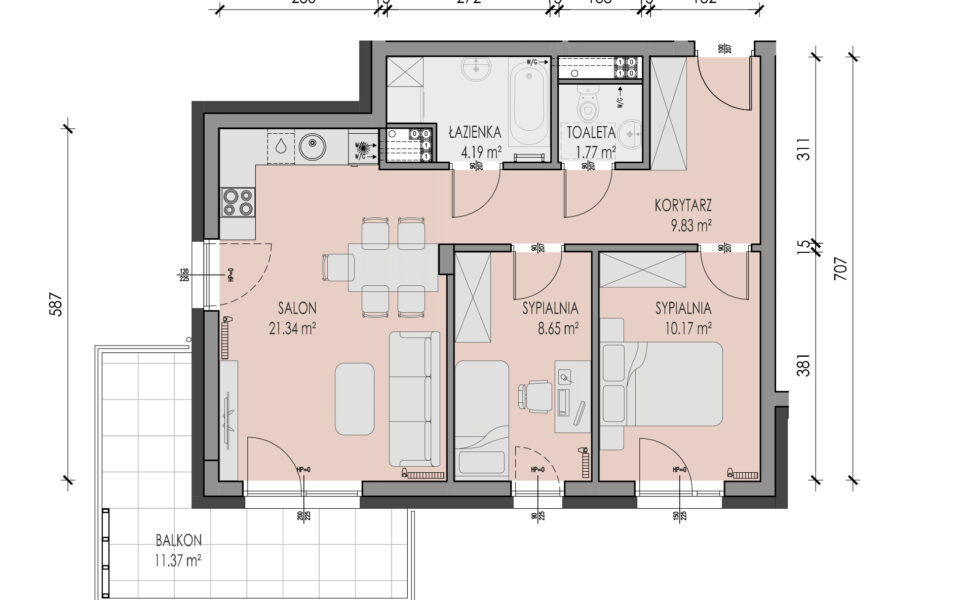 Prezentowane mieszkanie znajduje się na pierwszym piętrze budynku przy ulicy Legionów 25B, z oknami wychodzącymi na północ i zachód oraz dużym balkonem o powierzchni 11,37 m2. Składa się z salonu z aneksem kuchennym, dwóch sypialni, łazienki, toalety oraz przedpokoju. Jest wykończone w standardzie deweloperskim: