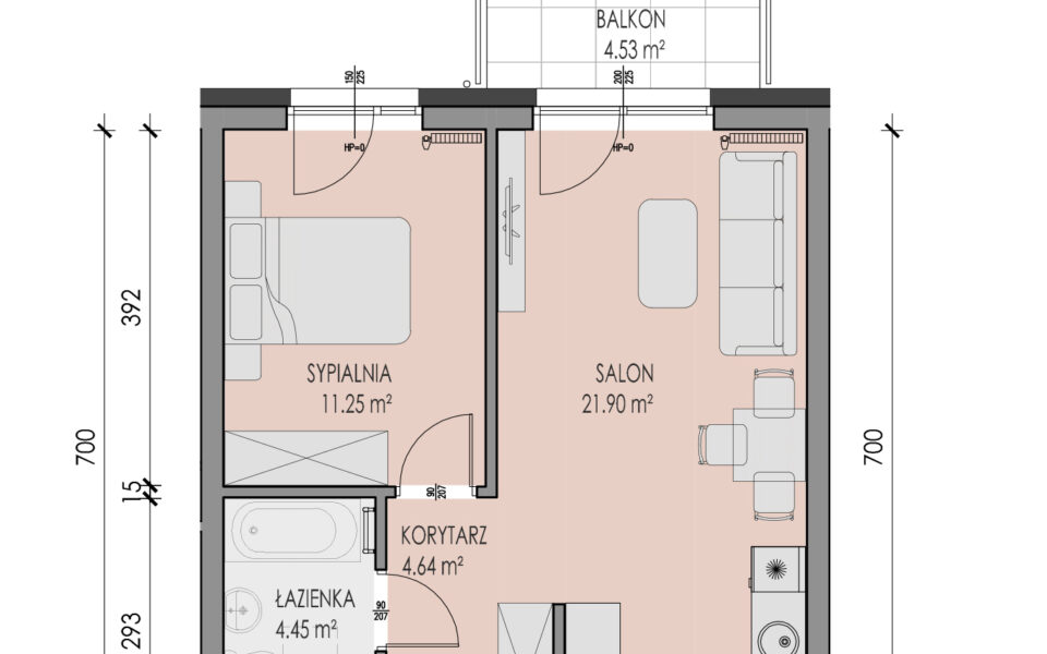 Prezentowane mieszkanie znajduje się na czwartym piętrze budynku przy ulicy Legionów 25B, z oknami wychodzącymi na wschód oraz balkonem o powierzchni 4,53 m2. Składa się z salonu z aneksem kuchennym, sypialni, łazienki oraz przedpokoju. Jest wykończone w standardzie deweloperskim: