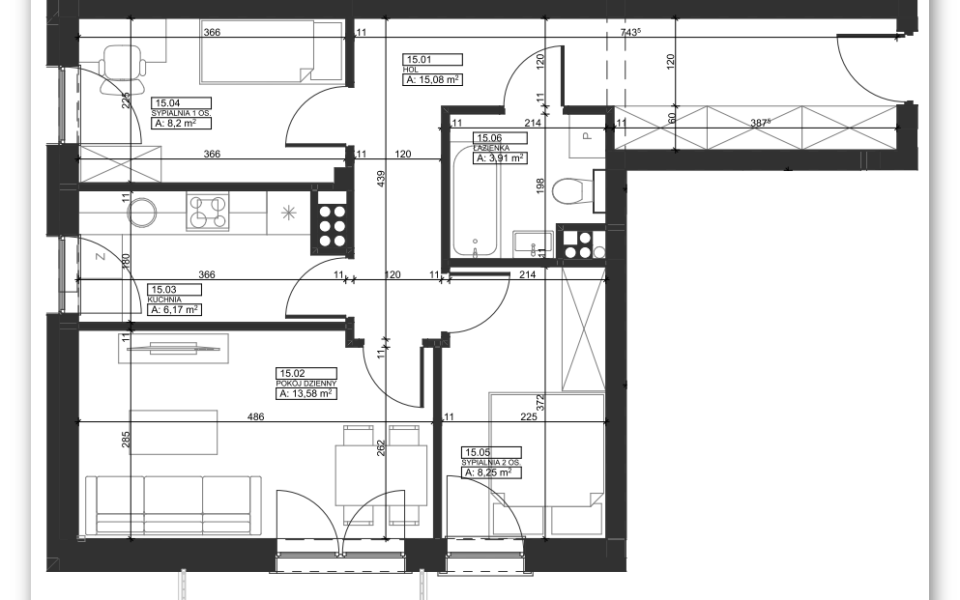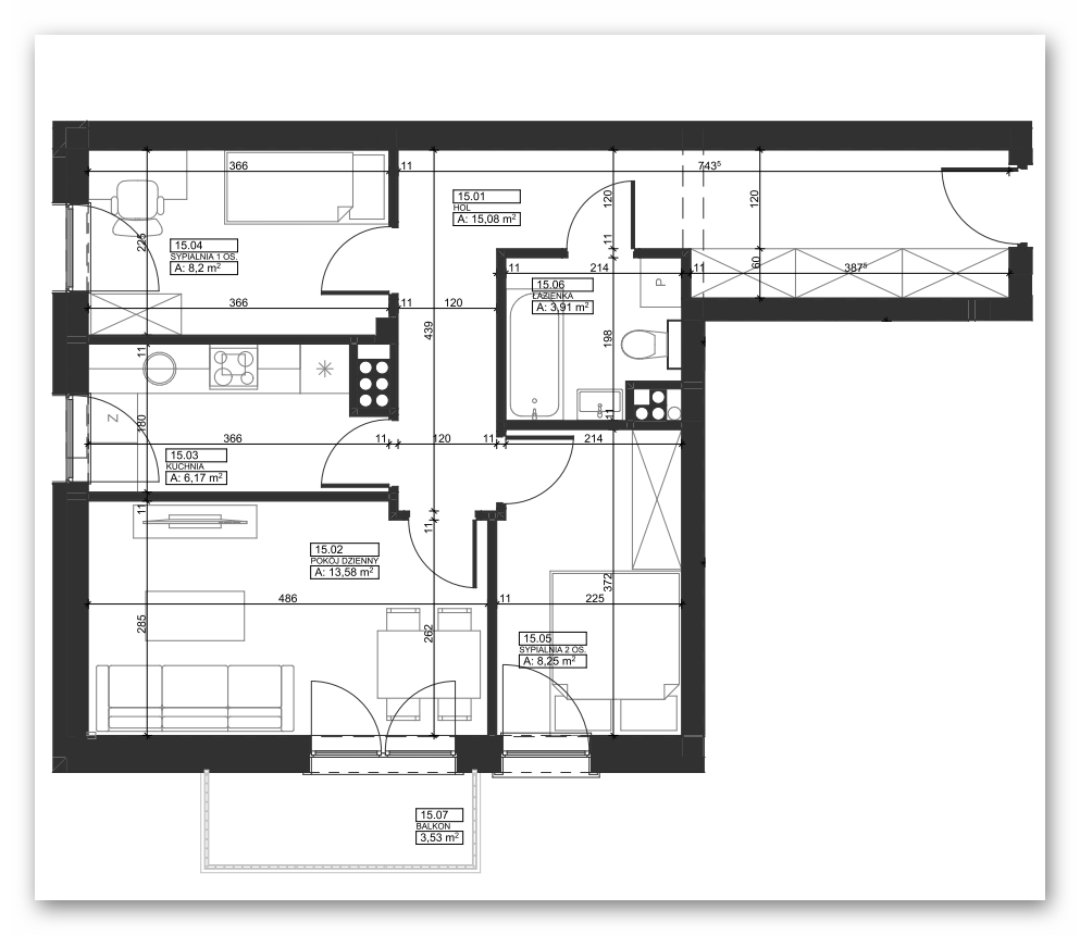Mieszkanie składa się z jasnego pokoju dziennego, z którego prowadzi wyjście na balkon o wschodniej ekspozycji, dwóch sypialni (jedna o ekspozycji wschodniej, druga – południowej), oddzielnej kuchni, łazienki oraz przedpokoju z miejscem na przestronną szafę.