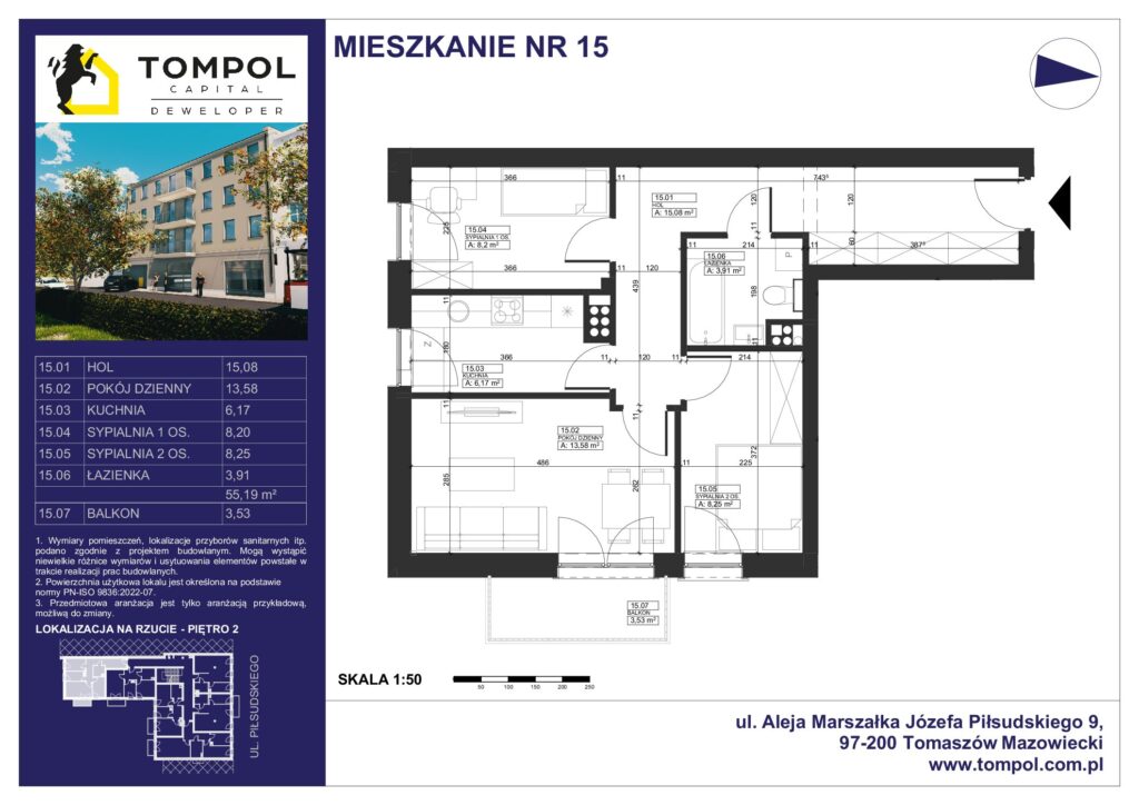 Oferujemy Państwu atrakcyjne mieszkanie nr 15 o powierzchni projektowej 55,19 m², położone na drugim piętrze kameralnego, czteropiętrowego budynku w nowej inwestycji przy ulicy Piłsudskiego 9 – w samym sercu Tomaszowa Mazowieckiego.