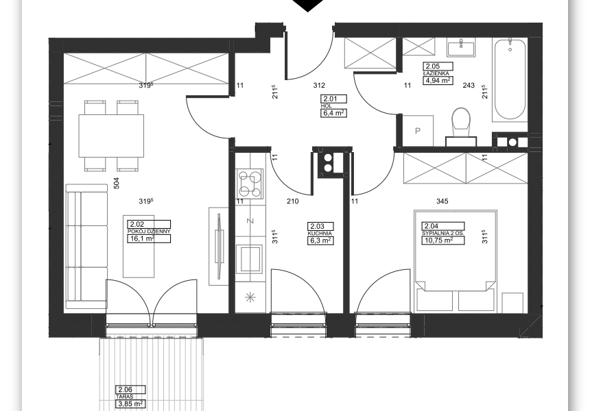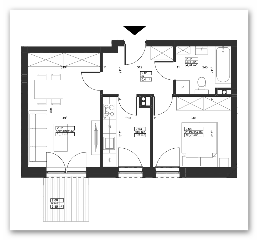 Mieszkanie składa się z jasnego pokoju dziennego, z którego prowadzi wyjście na taras o wschodniej ekspozycji, sypialni, oddzielnej kuchni, łazienki oraz przedpokoju z miejscem na pojemną szafę.