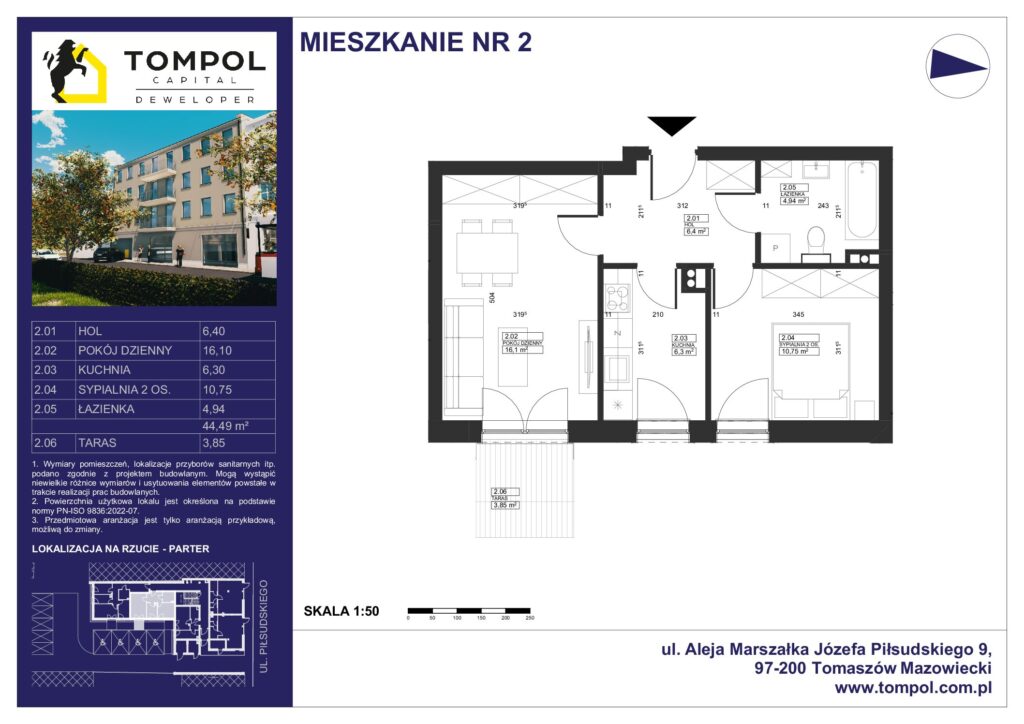 Oferujemy Państwu atrakcyjne mieszkanie nr 2 o powierzchni projektowej 44,49 m², położone na parterze kameralnego, czteropiętrowego budynku w nowej inwestycji przy ulicy Piłsudskiego 9 – w samym sercu Tomaszowa Mazowieckiego.