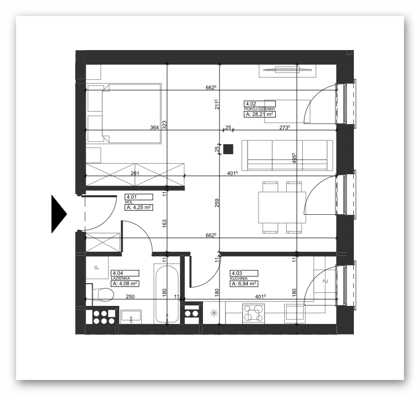 Mieszkanie składa się z jasnego pokoju dziennego o północnej ekspozycji, oddzielnej kuchni, łazienki oraz przedpokoju z miejscem na szafę.