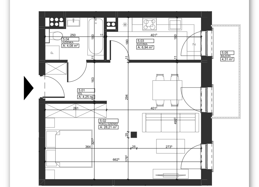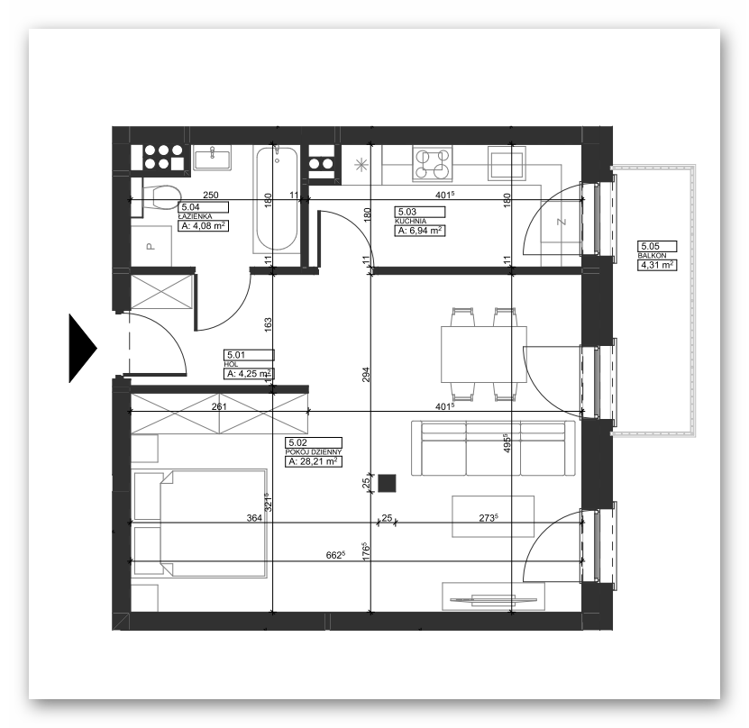 Mieszkanie składa się z jasnego pokoju dziennego, z którego prowadzi wyjście na taras o północnej ekspozycji, oddzielnej kuchni, łazienki oraz przedpokoju z miejscem na szafę.