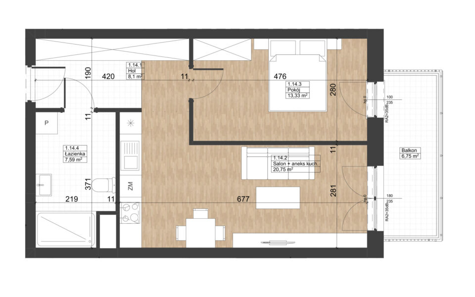 Prezentowane mieszkanie znajduje się na pierwszym piętrze budynku nr 4, z oknami i balkonem o powierzchni 6,75 m2 wychodzącymi na wschód. Składa się z pokoju dziennego z aneksem kuchennym, sypialni, łazienki oraz przedpokoju. Jest wykończone w standardzie deweloperskim:
