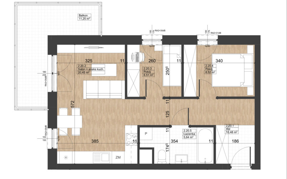 Prezentowane mieszkanie znajduje się na drugim piętrze budynku nr 4, z oknami wychodzącymi na zachód i północ oraz dużym, narożnym balkonem o powierzchni 11,25 m2 z północno-zachodnią ekspozycją. Składa się z pokoju dziennego z aneksem kuchennym, dwóch sypialni, łazienki oraz przedpokoju. Jest wykończone w standardzie deweloperskim: