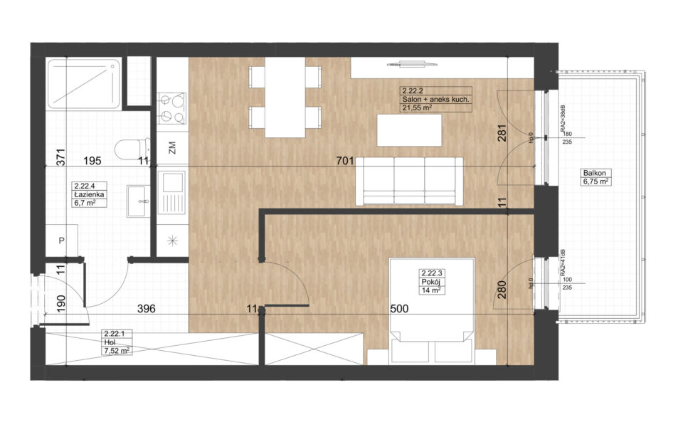 Prezentowane mieszkanie znajduje się na drugim piętrze budynku nr 4, z oknami oraz balkonem o powierzchni 6,75 m2 ze wschodnią ekspozycją. Składa się z pokoju dziennego z aneksem kuchennym, sypialni, łazienki oraz przedpokoju. Jest wykończone w standardzie deweloperskim: