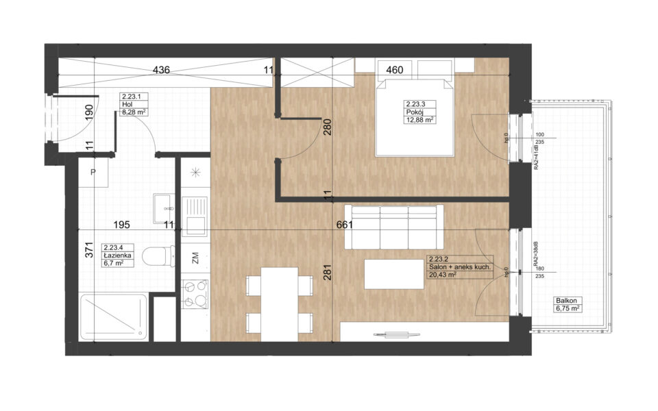 Prezentowane mieszkanie znajduje się na drugim piętrze budynku nr 4, z oknami oraz balkonem o powierzchni 6,75 m2 ze wschodnią ekspozycją. Składa się z pokoju dziennego z aneksem kuchennym, sypialni, łazienki oraz przedpokoju. Jest wykończone w standardzie deweloperskim: