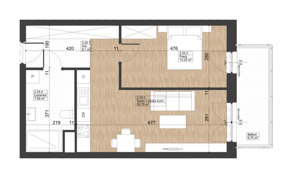 Prezentowane mieszkanie znajduje się na drugim piętrze budynku nr 4, z oknami oraz balkonem o powierzchni 6,75 m2 ze wschodnią ekspozycją. Składa się z pokoju dziennego z aneksem kuchennym, sypialni, łazienki oraz przedpokoju. Jest wykończone w standardzie deweloperskim: