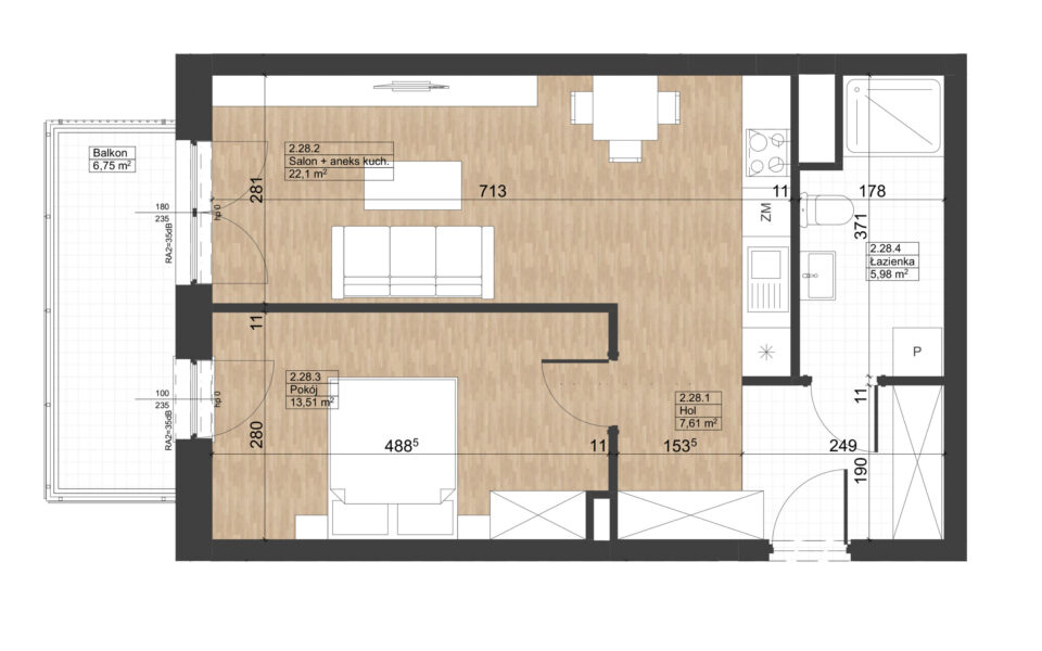 Prezentowane mieszkanie znajduje się na drugim piętrze budynku nr 4, z oknami oraz balkonem o powierzchni 6,75 m2 z zachodnią ekspozycją. Składa się z pokoju dziennego z aneksem kuchennym, sypialni, łazienki oraz przedpokoju. Jest wykończone w standardzie deweloperskim: