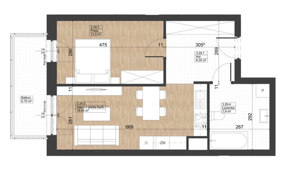 Prezentowane mieszkanie znajduje się na trzecim piętrze budynku nr 4, z oknami oraz balkonem o powierzchni 6,75 m2 z zachodnią ekspozycją. Składa się z pokoju dziennego z aneksem kuchennym, sypialni, łazienki oraz przedpokoju. Jest wykończone w standardzie deweloperskim: