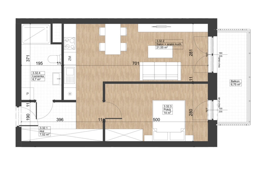 Prezentowane mieszkanie znajduje się na trzecim piętrze budynku nr 4, z oknami oraz balkonem o powierzchni 6,75 m2 ze wschodnią ekspozycją. Składa się z pokoju dziennego z aneksem kuchennym, sypialni, łazienki oraz przedpokoju. Jest wykończone w standardzie deweloperskim: