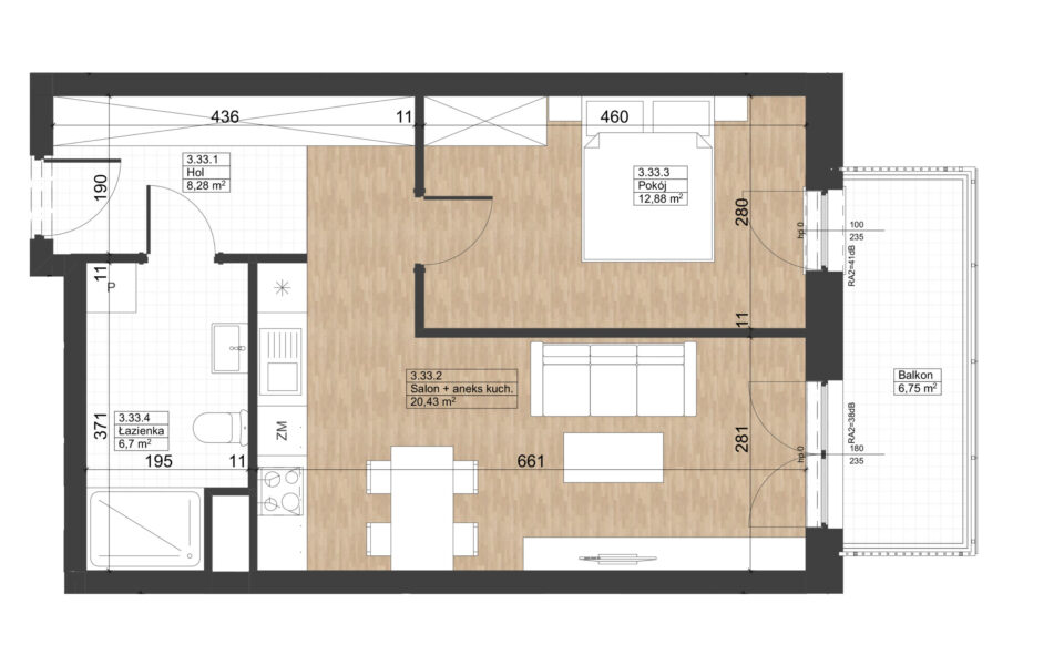 Prezentowane mieszkanie znajduje się na trzecim piętrze budynku nr 4, z oknami oraz balkonem o powierzchni 6,75 m2 ze wschodnią ekspozycją. Składa się z pokoju dziennego z aneksem kuchennym, sypialni, łazienki oraz przedpokoju. Jest wykończone w standardzie deweloperskim: