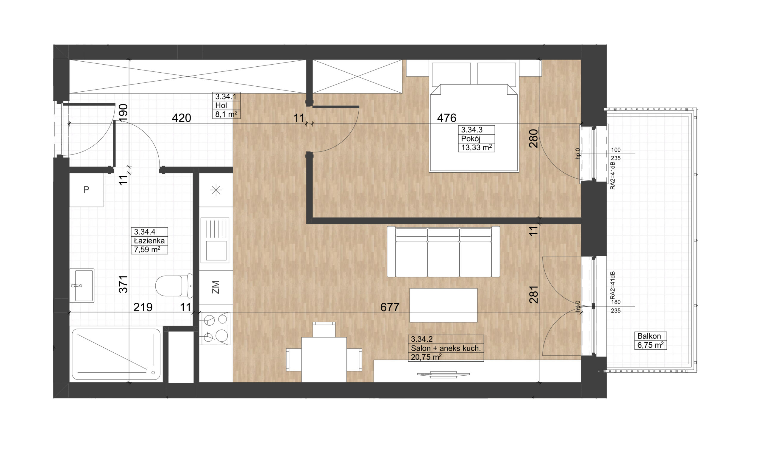 Prezentowane mieszkanie znajduje się na trzecim piętrze budynku nr 4, z oknami oraz balkonem o powierzchni 6,75 m2 ze wschodnią ekspozycją. Składa się z pokoju dziennego z aneksem kuchennym, sypialni, łazienki oraz przedpokoju. Jest wykończone w standardzie deweloperskim: