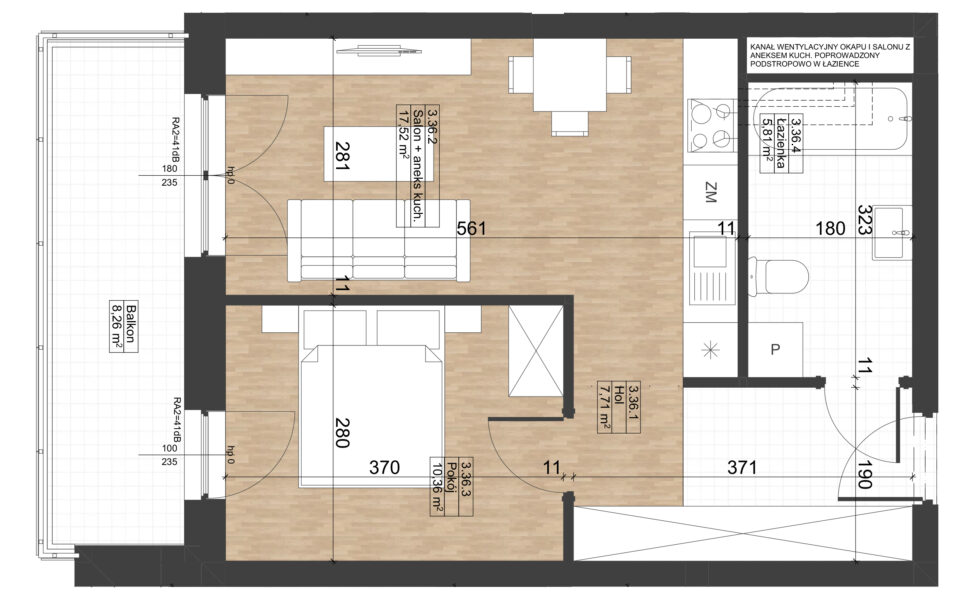 Prezentowane mieszkanie znajduje się na trzecim piętrze budynku nr 4, z oknami oraz balkonem o powierzchni 8,26 m2 z południową ekspozycją. Składa się z pokoju dziennego z aneksem kuchennym, sypialni, łazienki oraz przedpokoju. Jest wykończone w standardzie deweloperskim: