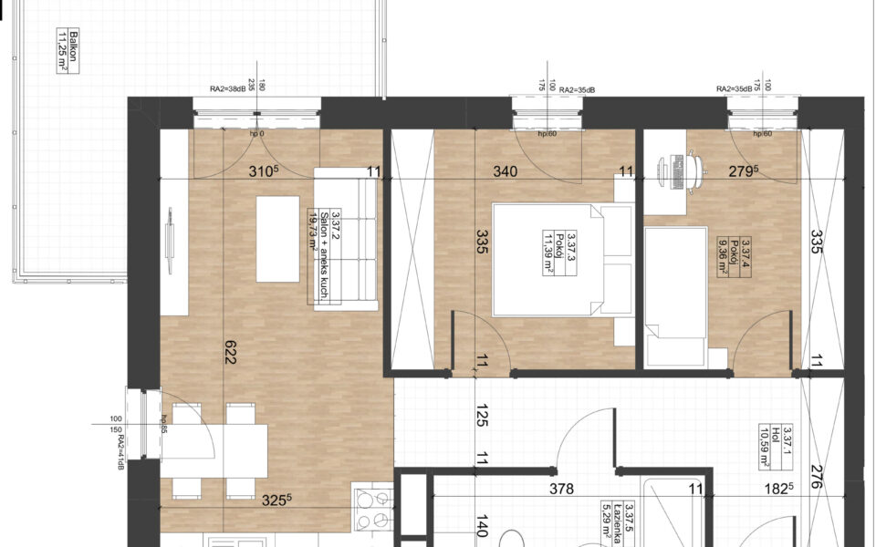 Prezentowane mieszkanie znajduje się na trzecim piętrze budynku nr 4, z oknami wychodzącymi na zachód (pokój dzienny, sypialnie) i południe (pokój dzienny) oraz dużym balkonem o powierzchni 11,25 m2 z południowo-zachodnią ekspozycją. Składa się z pokoju dziennego z aneksem kuchennym, dwóch sypialni, łazienki oraz przedpokoju. Jest wykończone w standardzie deweloperskim: