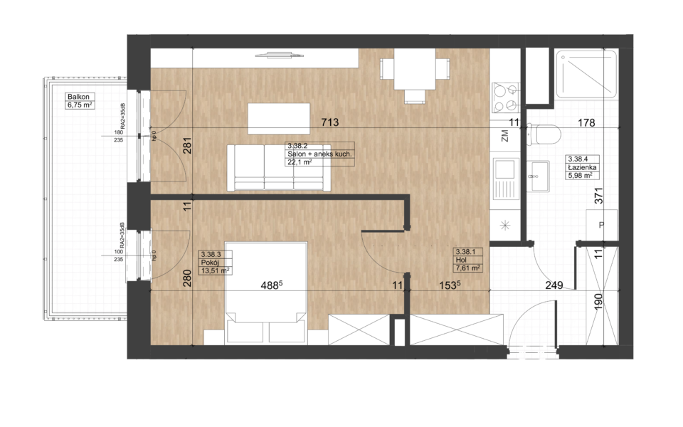 Prezentowane mieszkanie znajduje się na trzecim piętrze budynku nr 4, z oknami oraz balkonem o powierzchni 6,75 m2 z zachodnią ekspozycją. Składa się z pokoju dziennego z aneksem kuchennym, sypialni, łazienki oraz przedpokoju. Jest wykończone w standardzie deweloperskim: