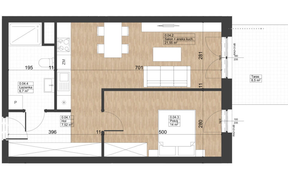 Prezentowane mieszkanie znajduje się na parterze budynku nr 4, z oknami wychodzącymi na zachód oraz zielonym i słonecznym tarasem o powierzchni 9,2 m2. Składa się z pokoju dziennego z aneksem kuchennym, sypialni, łazienki oraz przedpokoju. Jest wykończone w standardzie deweloperskim: