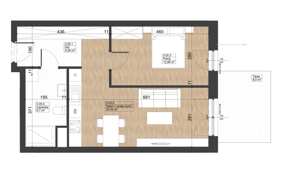 Prezentowane mieszkanie znajduje się na parterze budynku nr 4, z oknami wychodzącymi na wschód oraz zielonym i słonecznym tarasem o powierzchni 8,5 m2. Składa się z pokoju dziennego z aneksem kuchennym, sypialni, łazienki oraz przedpokoju. Jest wykończone w standardzie deweloperskim: