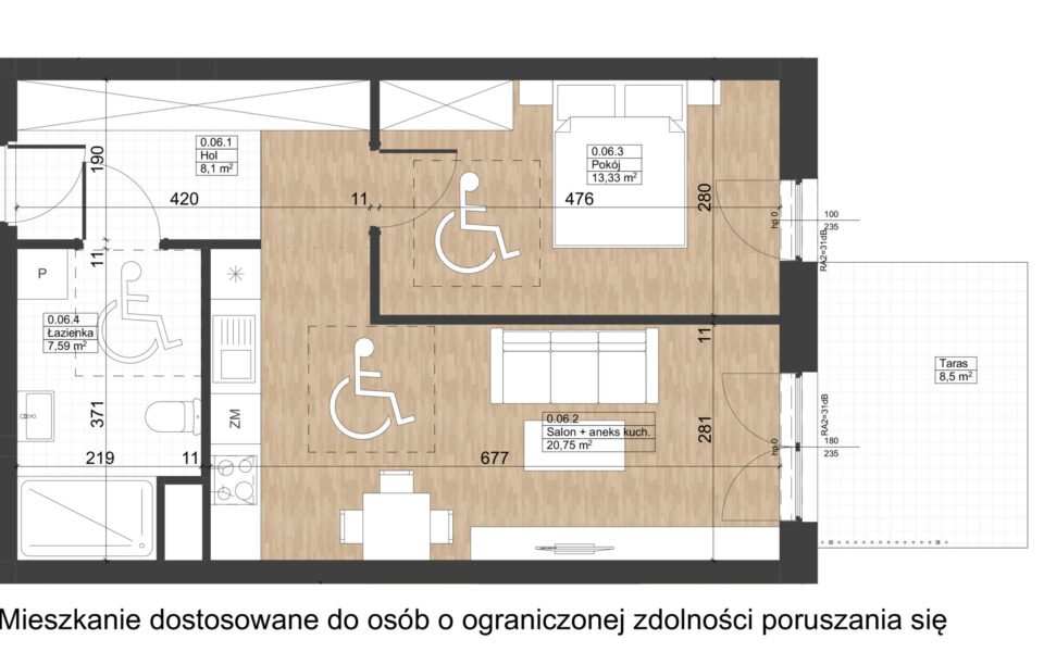 Prezentowane mieszkanie znajduje się na parterze budynku nr 4, z oknami wychodzącymi na wschód oraz zielonym i słonecznym tarasem o powierzchni 8,5 m2. Składa się z pokoju dziennego z aneksem kuchennym, sypialni, łazienki oraz przedpokoju. Jest wykończone w standardzie deweloperskim: