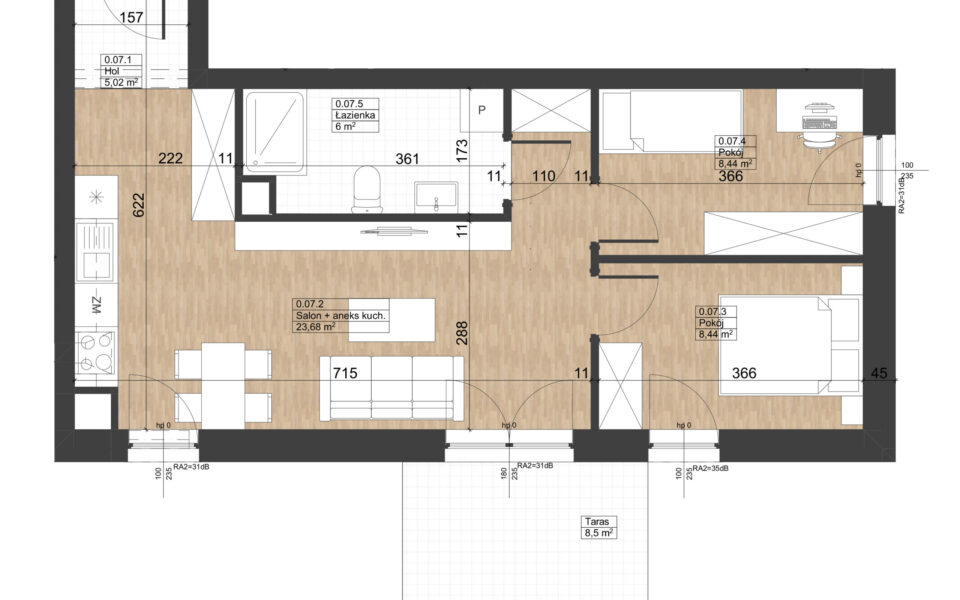 Prezentowane mieszkanie znajduje się na parterze budynku nr 4, z oknami wychodzącymi na południe i wschód oraz zielonym i słonecznym tarasem o powierzchni 8,5 m2. Składa się z pokoju dziennego z aneksem kuchennym, dwóch sypialni, łazienki oraz przedpokoju. Jest wykończone w standardzie deweloperskim: