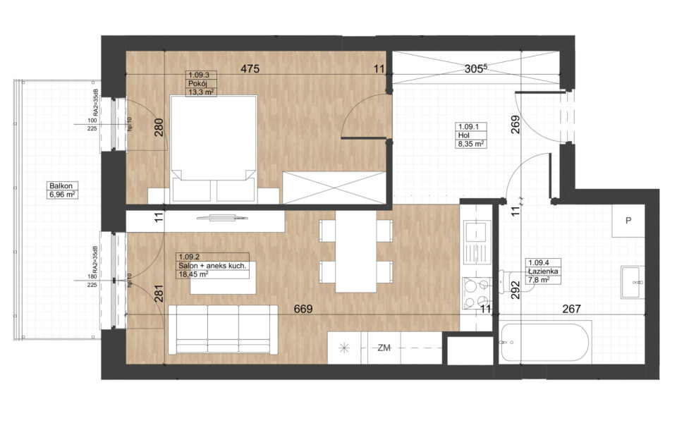 Prezentowane mieszkanie znajduje się na pierwszym piętrze budynku nr 4, z oknami wychodzącymi na zachód oraz słonecznym balkonem o powierzchni 6,96 m2. Składa się z pokoju dziennego z aneksem kuchennym, sypialni, łazienki oraz przedpokoju. Jest wykończone w standardzie deweloperskim: