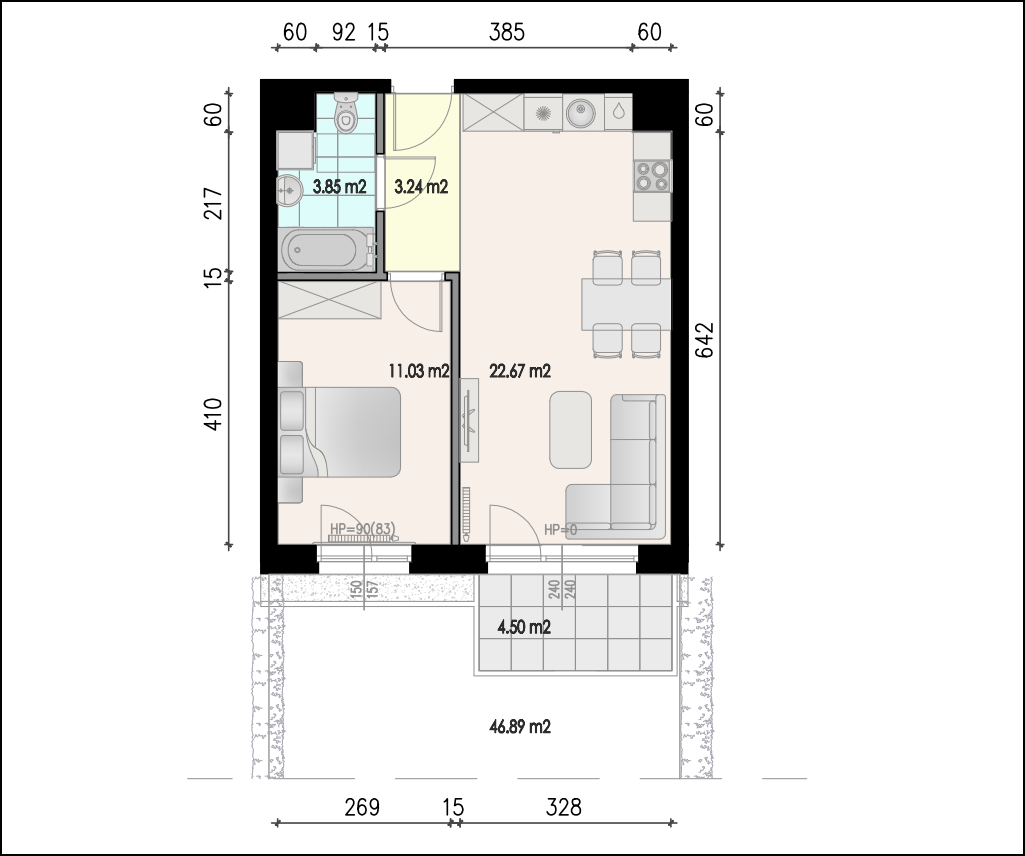 Mieszkanie położone na parterze budynku położonego przy ulicy Spalskiej 58 w Tomaszowie Mazowieckim. Usytuowane na wschód z tarasem 4,50 m2 oraz dodatkowo ogródek 46,89 m2. Mieszkanie składa się z pokoju z aneksem kuchennym, sypialni, WC oraz holu. Wykończone w standardzie deweloperskim: